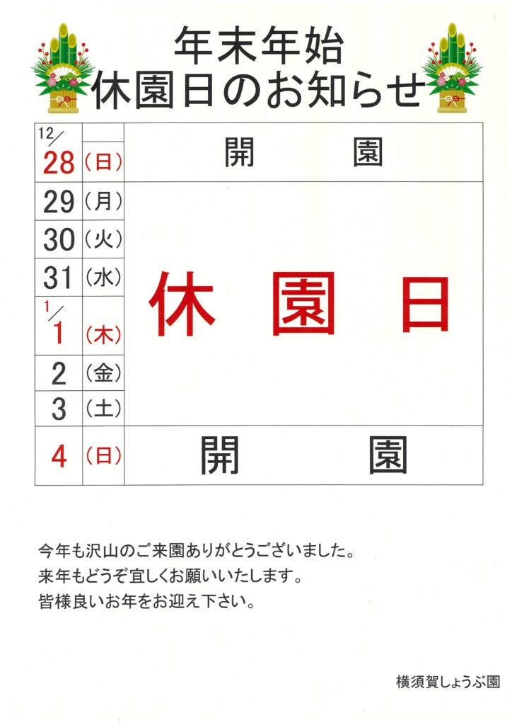 令和7年12月29日(月)~令和8年1月3日(土)まで休園とさせていただきます。