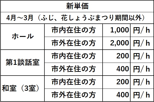 ・展示室(ホール)・市内在住の方:1時間ごとに840円 / 市外在住の方:1時間ごと1,680円 ・休憩室(洋室)・市内在住の方:1時間ごとに320円 / 市外在住の方:1時間ごと640円 ・休憩室(和室・3室)・市内在住の方:1時間ごとに210円 / 市外在住の方:1時間ごとに420円